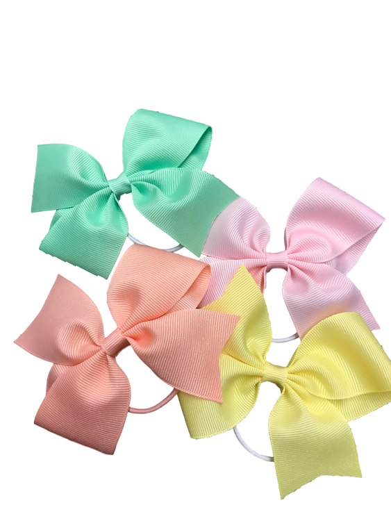 One of our most popular styles, these bows are attached to a stretchy band. Made with 1 1/2" width grosgrain ribbon. Great for both ponytails and pigtails.